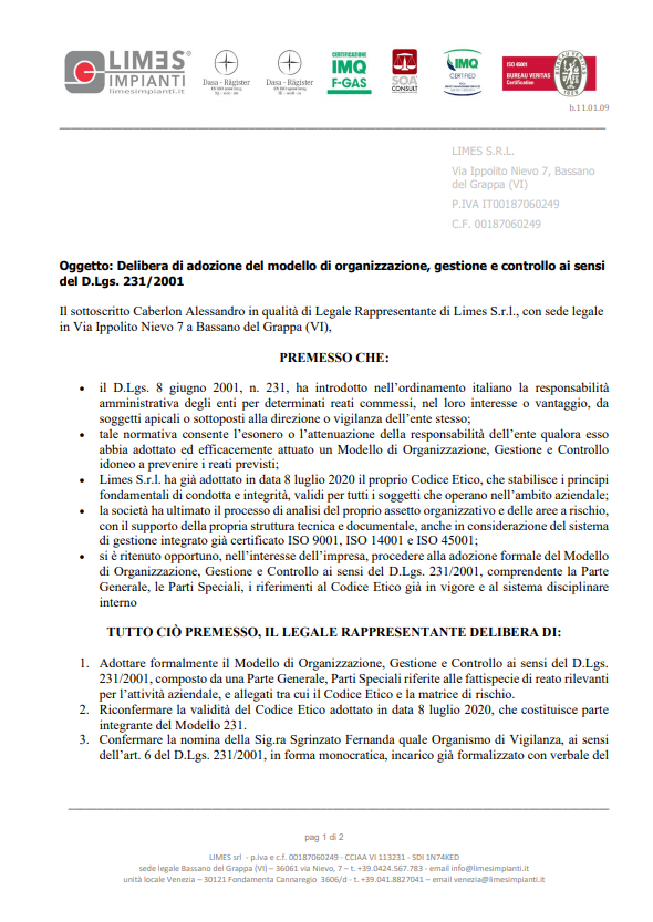 In data 14 luglio 2025, Limes srl ha formalizzato l’adozione del Modello di Organizzazione, Gestione e Controllo (MOG 231), in conformità a quanto previsto dal Decreto Legislativo 231/2001.