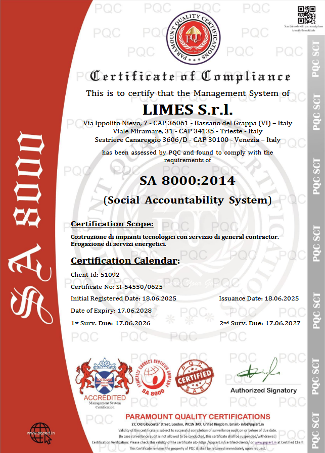 In data 18 giugno 2025, Limes srl ha ottenuto la certificazione SA8000, standard internazionale che attesta il rispetto dei principi di responsabilità sociale e la tutela dei diritti dei lavoratori.